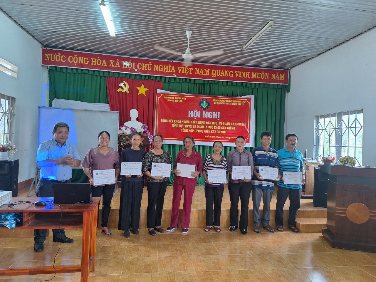 Củng tại buổi bế giảng BTC đã trao chứng nhận khoá huấn luyện Nông Dân (FFS) về quản lý dịch hại Tổng hợp (IPM) Và Quản lý Sức khoẻ Cây Trồng Tổng hợp (IPHM) trên cây có múi cho 30 học viên hoàn thành khóa học.