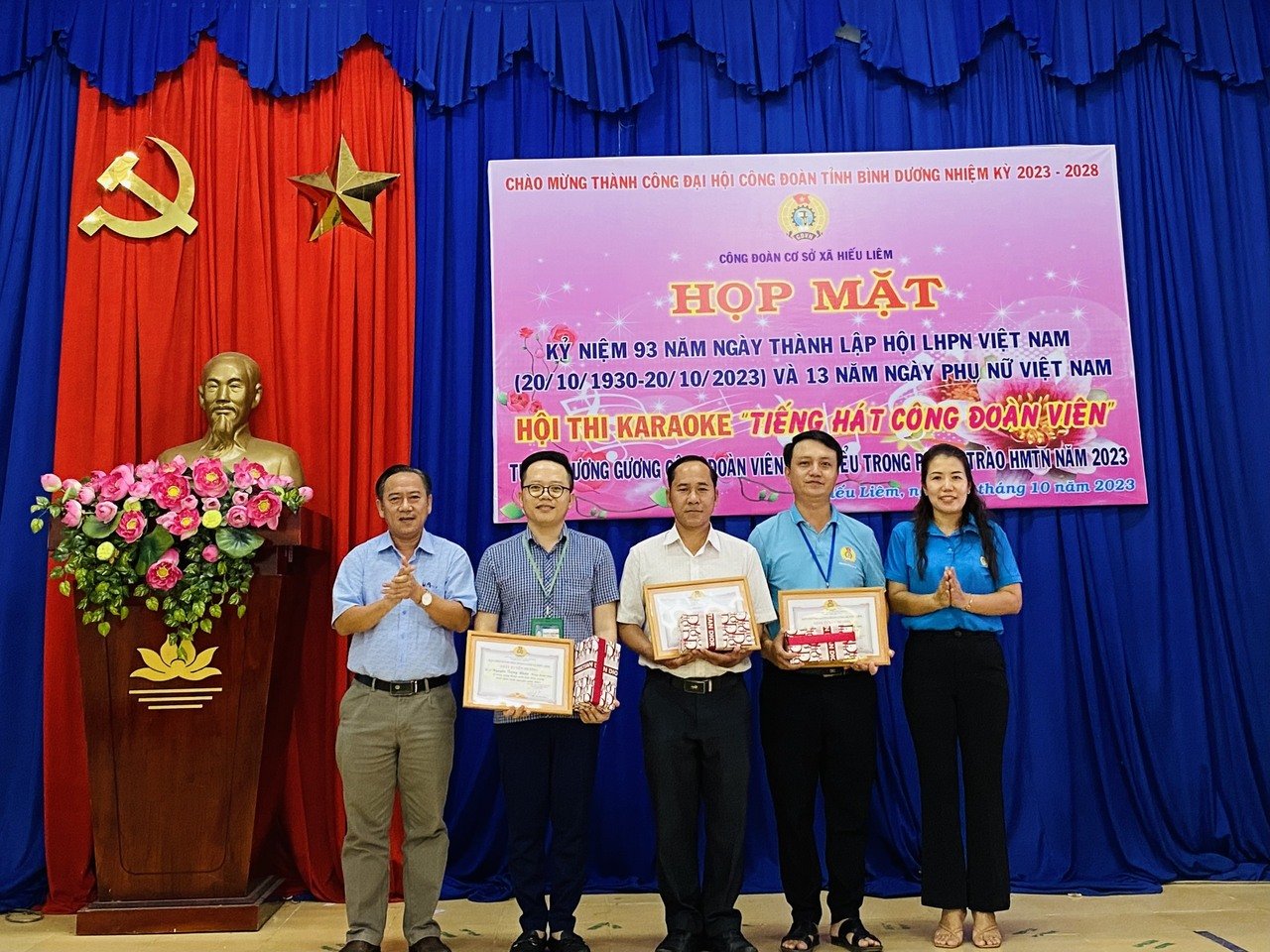 Củng tại buổi họp mặt công đoàn cơ sở xã Hiếu Liêm tổ chức hội thi karaoke “Tiếng hát công đoàn viên”, có 5 cặp thí sinh tham gia, kết thúc hội thi BTC đã trao giải thưởng cho các cặp thí sinh tham gia.Đồng thời công đoàn xã đã tuyên dương 3 gương công đoàn viên tiêu biểu trong phong trào hiến máu tình huyện năm 2023 .Kết thúc buổi họp mặt lãnh đạo địa phương, BCH CĐCS xã đã trao quà tặng gửi đến tất cả nữ công đoàn cơ quan.