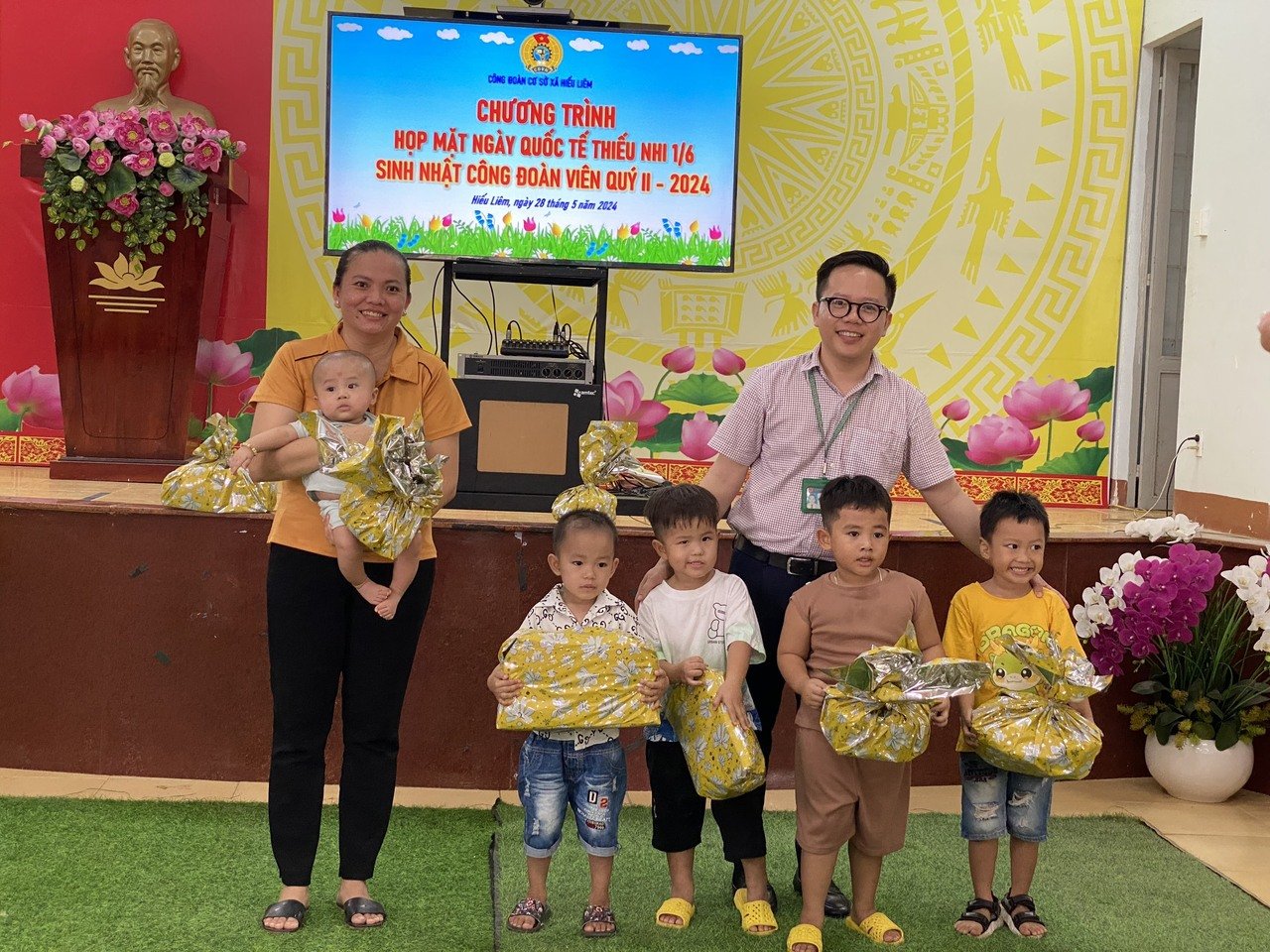 Kết thúc buổi họp mặt lãnh đạo địa phương, BCH CĐCS xã Hiếu Liêm đã trao 30 phần quà cho các em thiếu nhi con của công đoàn viên và trao tặng 10 phần quà chúc mừng sinh nhật cho 10 CĐV tổng kinh phí khoảng 7 triệu đồng.