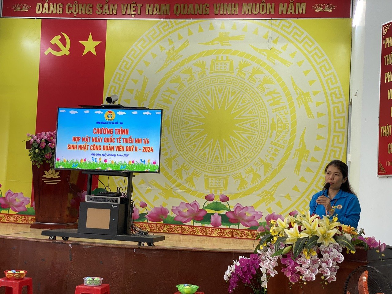 Trong chương trình Bà Trần Thị Diệu Hiền, chủ tịch CĐCS và ông Nguyễn Phước Thiện, PBT đảng ủy xã phát biểu chúc mừng đến các em thiếu nhi con của công đoàn viên nhân dịp ngày quốc tế thiếu nhi 01/6, và các công đoàn viên có ngày sinh nhật trong quí II.