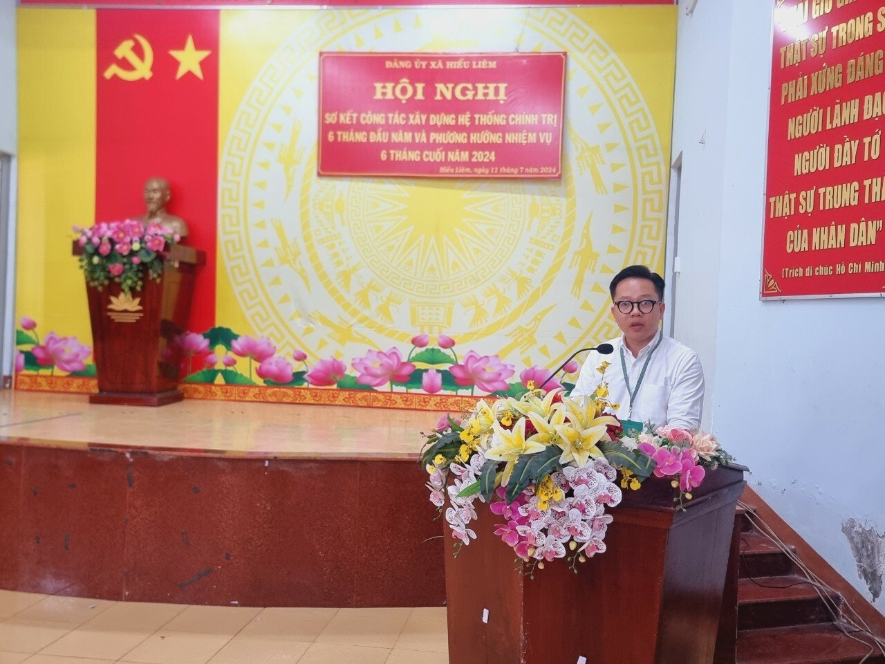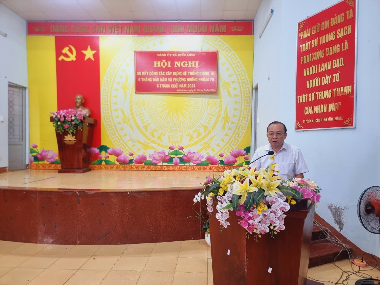 Phát biểu chỉ đạo hội nghị đồng chí Lê Văn Quý – UVTV huyện uỷ, Phó Chủ tịch HĐND huyện đã ghi nhận những kết quả mà Đảng uỷ, chính quyền, MTTQVN xã, đoàn thể xã đã đạt được trong 6 tháng đầu năm 2024. Đồng thời chỉ đạo một số nội dung quan trọng để Đảng bộ, chính quyền cần tập trung thực hiện như: rà soát các chỉ tiêu chưa đạt, đưa ra giải pháp tháo gỡ thực hiện hoàn thành các chỉ tiêu mà nghị quyết đề ra; tiếp tục quan tâm hoàn thành chỉ tiêu phát triển đảng viên theo chỉ tiêu huyện mới giao cho địa phương, thực hiện tốt và nâng cao chỉ số cải cách hành chính trong thời gian tới, giữ vững và nâng cao chất lượng các bộ tiêu chí về Nông thôn mới đã đạt, chuẩn bị tốt việc tổ chức lễ công nhận xã đạt Nông thôn mới Kiểu mẫu, và công tác diễn tập chiến đấu xã Hiếu liêm trong khu vực phòng thủ trên địa bàn trong tháng 8/2024. chuẩn bị tốt công tác nhân sự các Chi bộ trực thuộc và Đại hội Đảng bộ xã lần thứ V, nhiệm kỳ 2025 – 2030.