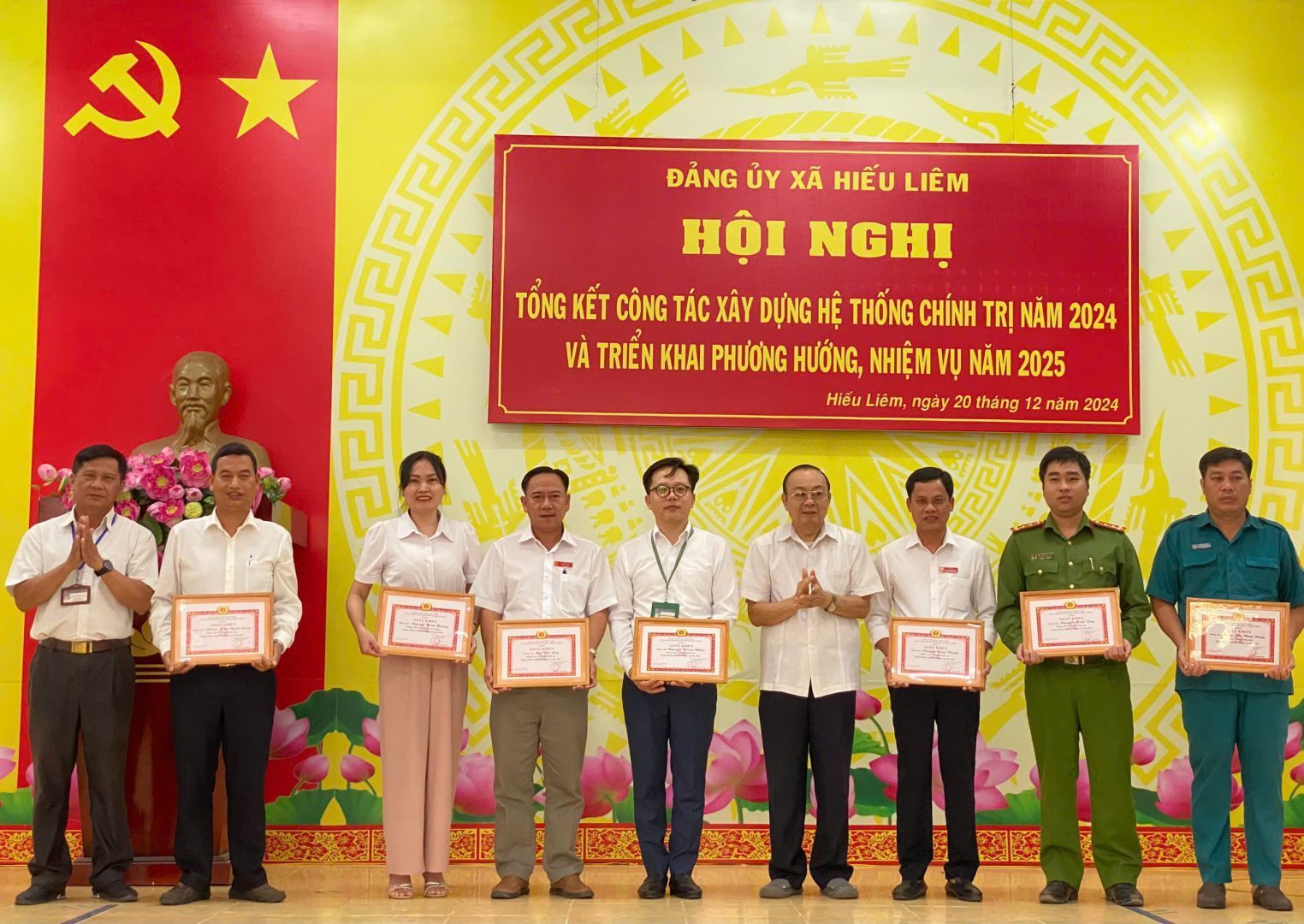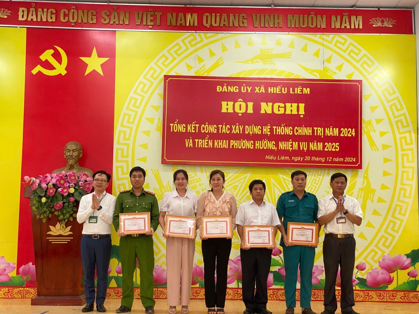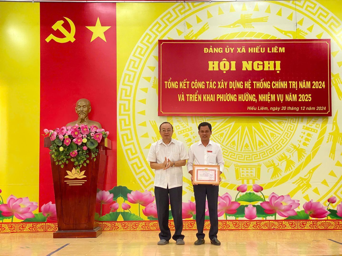 Trong năm 2024, Ban Thường vụ Đảng ủy xã Hiếu Liêm đã tập trung lãnh đạo, chỉ đạo các Chi bộ trực thuộc, các ngành, đoàn thể trong xã tổ chức phổ biến, quán triệt, triển khai thực hiện các Nghị quyết, Kết luận, Chỉ thị, Chương trình, Kế hoạch của Trung ương, Tỉnh ủy và Huyện ủy theo đúng quy định. Đảng ủy xã thực hiện nghiêm việc rà soát, bổ sung quy hoạch cán bộ nhiệm kỳ 2020 - 2025 và nhiệm kỳ 2025 - 2030 theo đúng chỉ đạo của cấp trên. Công tác phát triển đảng được tiếp tục chú trọng, nhất là trong lực lượng đoàn viên, thanh niên ưu tú, lực lượng vũ trang, công nhân lao động. Đến nay, đã xem xét kết nạp 4 đảng viên, nâng tổng số đảng viên toàn xã hiện nay lên 100 đảng viên. Đảng ủy luôn quan tâm chỉ đạo quán triệt, triển khai kịp thời các quy định về công tác kiểm tra, giám sát, kỷ luật trong Đảng để nâng cao nhận thức của các cấp ủy đảng trong việc tổ chức thực hiện công tác kiểm tra, giám sát của Đảng; gắn với rà soát, bổ sung, hoàn thiện quy chế làm việc và các quy chế phối hợp trong thực hiện công tác kiểm tra, giám sát của các cấp ủy đảng. Tăng cường và quan tâm đổi mới sự lãnh đạo của Đảng đối với công tác dân vận của Đảng và cả hệ thống chính trị, nhất là việc đổi mới nội dung, phương thức hoạt động của MTTQ và các đoàn thể; đẩy mạnh thực hiện phong trào thi đua “Dân vận khéo”, gắn với “Đẩy mạnh học tập và làm theo tư tưởng, đạo đức, phong cách Hồ Chí Minh”. Trong năm tổ chức 32 buổi ra quân dọn dẹp vệ sinh môi trường, cảnh quan nơi làm việc và chăm sóc các tuyến đường hoa với 635 người tham gia, kinh phí thực hiện hơn 26 triệu đồng đồng; trao tặng 1.063 phần quà cho các hộ nghèo, hộ khó khăn, trẻ mồ côi, khuyết tật trên địa bàn xã trị giá hơn 329 triệu đồng; xây dựng 3 căn nhà cho hộ khó khăn về nhà ở trị giá 380 triệu đồng.