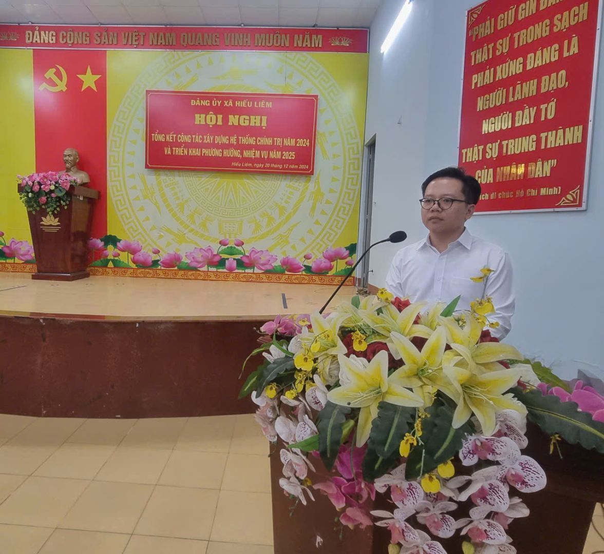 Sáng ngày 20/12, Đảng ủy xã Hiếu Liêm tổ chức hội nghị tổng kết công tác xây dựng đảng, hệ thống chính trị năm 2024. Dự hội nghị có đồng chí Lê Văn Quý - Ủy viên Thường vụ huyện uỷ - Phó Chủ tịch HĐND huyện, đồng chí Nguyễn Phước Thiện – PBT đảng uỷ; đồng chí Mai Đức Quý – PBT đảng uỷ, Chủ tịch UBND xã; đồng chí Trần Thị Diệu Hiền – ĐUV, Chủ tịch UBMTTQ Việt Nam xã; Lãnh đạo Đảng uỷ - HĐND – UBND – UBMTTQ Việt Nam xã, các ngành, đoàn thể, trưởng BĐH, BCTMT các ấp.