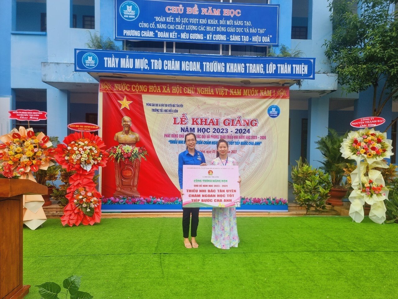 Thực hiện tiếp sức đến trường Hội LHPN xã đã trao 100 quyển tập trắng cho học sinh có hoàn cảnh khó khăn, Hội Nông Dân trao 10 thẻ bảo hiểm y tế cho 10 em hoc sinh khó khăn. Và Hội đồng đội xã đã trao tặng công trình Măng Non 3 triệu đồng.