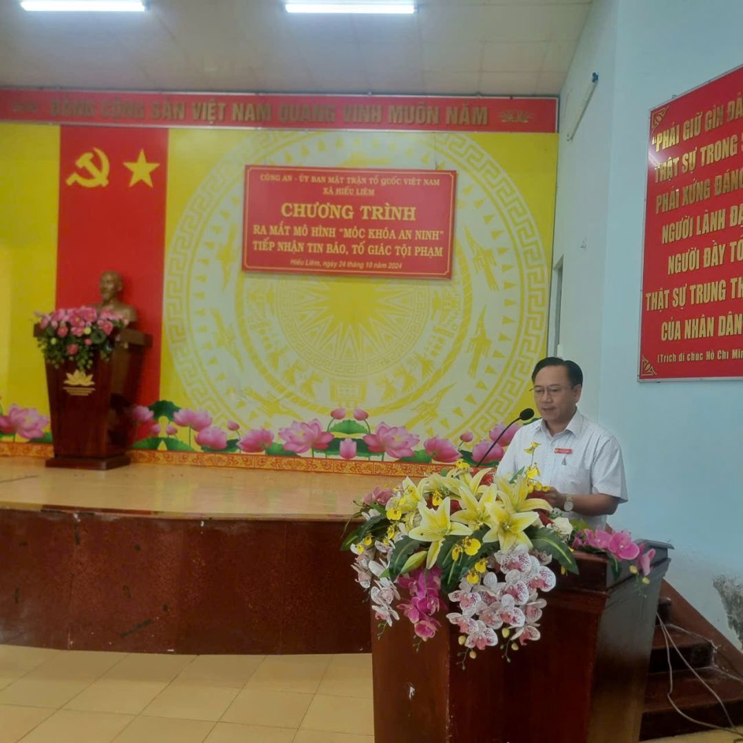 Sáng ngày 24/10/2024. Công xã phối hợp cùng UBMTTQ Việt Nam xã Hiếu Liêm tổ chức chương trình ra mắt mô hình “Móc khoá an ninh” tiếp nhận tin báo, tố giác tội phạm. Tham dự chương trình có ông Nguyễn Phước Thiện – PBT Đảng uỷ; ông Mai Đức Quý – PBT đảng uỷ, Chủ tịch UBND xã; ông Nguyễn Văn Đạt – ĐUV, PCT HĐND xã; bà Trần Thị Diệu Hiền – ĐUV, Chủ tịch UBMTTQ VN xã; Công an xã; đại diện các ngành, đoàn thể, BĐH, BCTMT các ấp, Lực lượng tham gia bảo vệ ANTT ở cơ sở, mạnh thường quân, chủ trang trại nhà vườn, các cơ sở kinh doanh và nhân dân trên địa bàn xã.