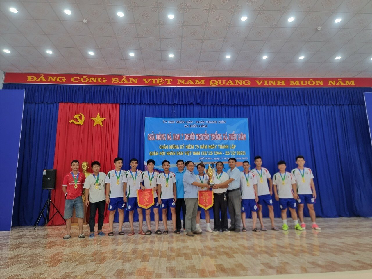 Thiết thực lập thành tích chào mừng Kỷ niệm 79 năm ngày thành lập Quân đội nhân dân Việt Nam (22/12/1944-22/12/2023) và 34 năm Ngày Hội Quốc phòng toàn dân (22/12/1989 – 22/12/2023). Ngày 17/12/2023. UBND phối hợp ĐTN xã Hiếu Liêm tổ chức giải bóng đá Nam 7 người, chào mừng kỷ niệm 79 năm ngày thành lập QĐND Việt Nam (22/12/1944 – 22/12/2023) và 34 năm Ngày Hội Quốc phòng toàn dân . Tham dự có ông Nguyễn Hoài Bích – Phó giám đốc TTVHTT&TT huyện, Ông Mai Đức Quý – PBT Đảng ủy, chủ tịch UBND xã, ông Nguyễn Thanh Tuấn – PCT UBND xã, trưởng BTC giải, các đồng chí lãnh đạo địa phương, các ngành, đoàn thể, chi bộ, BĐH, BCTMT các ấp, BTC giải, các vận động viên về tham dự giải, và đông đảo cổ động viên tham gia cổ vũ cho các đội. Giải lần này trên địa bàn xã Hiếu Liêm có 04 đội bóng tham gia Ấp Cây Dừng, Ấp Chánh Hưng, ấp Cây Dâu, và Liên Quân Công an – Quân sự. Các đội bốc thăm thi đấu đá loại trực tiếp. Kết quả thi đấu ấp Cây Dừng đã đạt giải nhất, ấp Cây Dâu đạt giải nhì, giải ba Liên quân Công an – Quân sự, và ấp Chánh Hưng đạt giải phong cách. BTC đã trao cúp, huy chương, cờ và tiền thưởng cho đội đạt giải nhất, trao huy chương, cờ, tiền thưởng cho đội đạt giải nhì, giải ba, và trao cờ tiền thưởng cho đội đạt giải phong cách. Đồng thời BTC đã trao giải cổ động viên đến cổ vũ đông và nhiệt tình nhất cho cổ động viên ấp Cây Dừng.