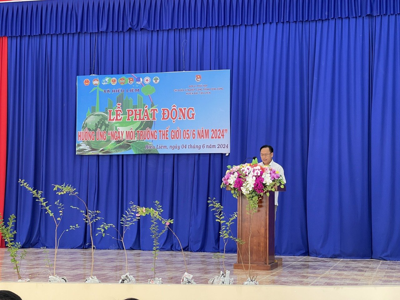 Sáng ngày 04/6/2024. Tại Trung tâm Văn hoá học tập cộng đồng xã Hiếu Liêm, UBND, UBMTTQ VN xã, các đoàn thể, chi đoàn xí nghiệp công trình công cộng huyện Bắc Tân Uyên phối hợp tổ chức lễ phát động ra quân hưởng ứng Ngày Môi trường Thế giới 05/6/2024. Tham dự lễ phát động, về lãnh đạo địa phương có ông Nguyễn Trọng Nhân – HUV, Bí thư đảng uỷ, Chủ tịch HĐND xã; ông Nguyễn Phước Thiện - PBT đảng uỷ; ông Mai Đức Quý – PBT đảng uỷ, Chủ tịch UBND xã; bà Trần Thị Diệu Hiền - Chủ tịch UBMTTQ xã; Về Chi đoàn xí nghiệp công trình công cộng huyện có bà Trần Thị Hải Yến – Bí thư chi đoàn; bà Trần Thị Thu Trang – Chủ tịch công đoàn xí nghiệp công trình công cộng huyện; cùng các ngành, đoàn thể xã; đoàn viên chi đoàn xí nghiệp công trình công cộng huyện; chi bộ, BĐH, BCTMT ấp Cây Dừng và 100 hộ dân trên địa bàn xã.